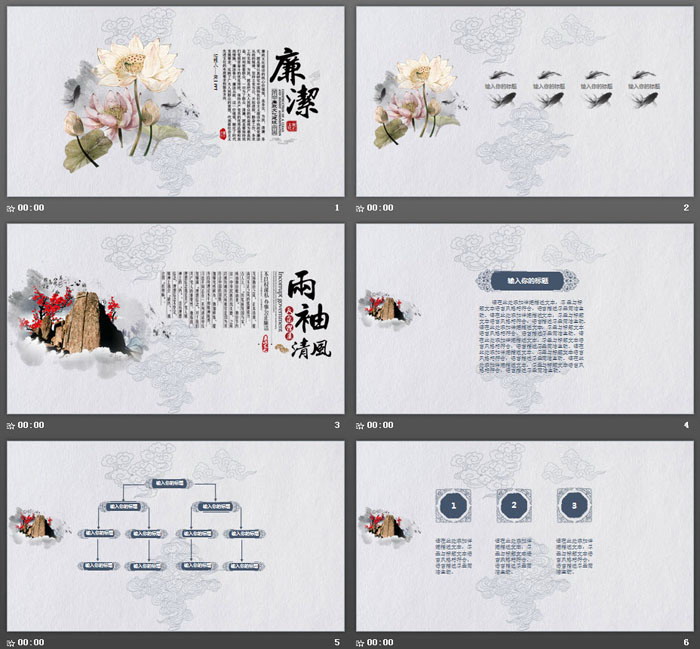 PPT模板封面,放置了两朵水墨荷花PPT背景图片。右侧放置毛笔字书写的廉洁PPT标题文字。界面背景莲花 通 廉洁。