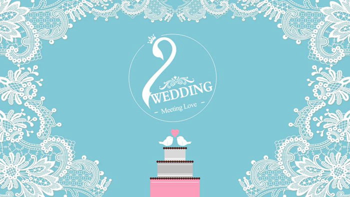幻灯片模板使用了清新蓝色背景色,和白色精美花边PPT背景图片。婚礼相册PPT模板首页,中间放置带有皇冠的白天鹅图案,和wedding艺术字。下方摆放了卡通蛋糕图片,与婚礼主题搭配。