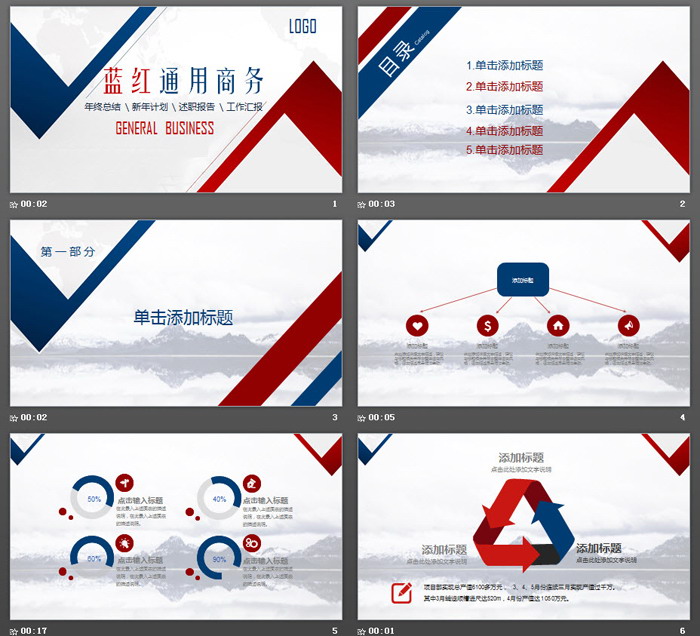 这是一套红蓝配色的,通用商务PPT模板,共27张;