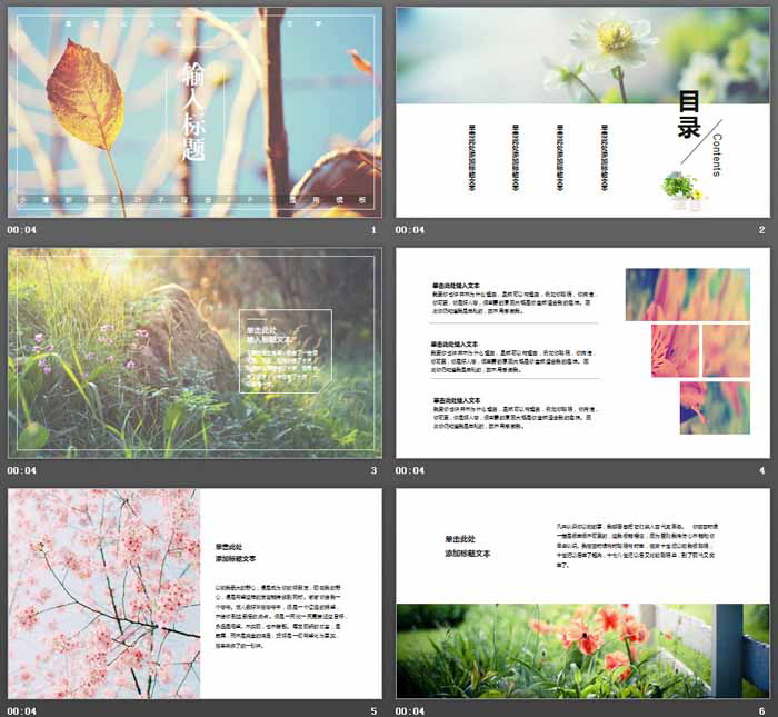 PPT模板使用了多张唯美清新植物图片排版制作。搭配文本文案排版。设计清新简洁。
