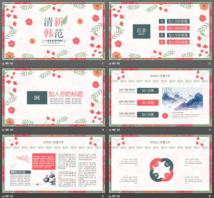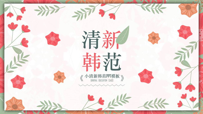 PPT模板使用了矢量绘制的红色花卉、绿色叶子等背景元素。中间田字形填写清新韩范PPT标题文字。界面风格清新韩范。