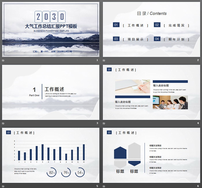 本模板设计大气,适合用于制作各类年终工作总结汇报PPT、通用商务PPT等。