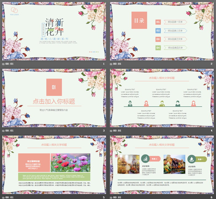 PPT模板使用了繁花似锦的韩范花卉背景图片。中间放置一个带有阴影效果的不规则矩形,填写PPT标题文字。界面清新时尚。