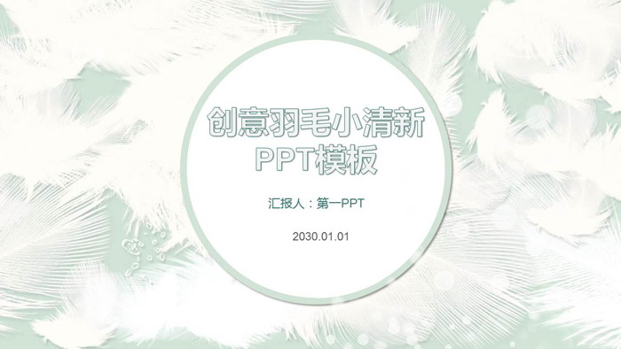 PPT模板使用了一张绿色底图上布满羽毛的背景图片。首页,中间放置圆形图案,填写PPT标题文字。界面简洁淡雅。
