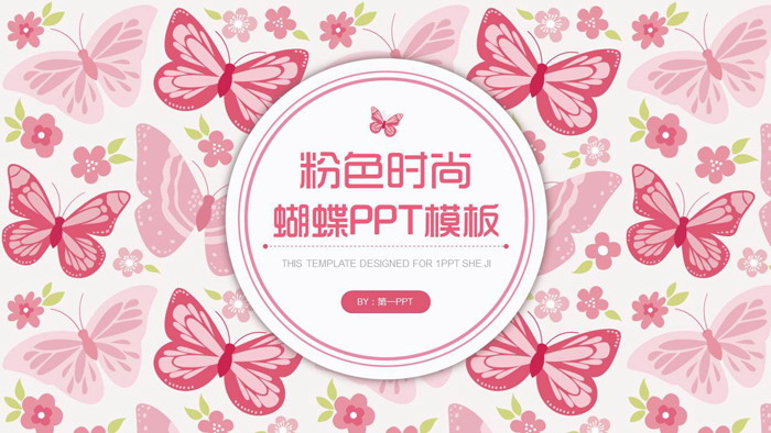PPT模板使用了粉色蝴蝶图案与桃花图案背景图片。首页中间放置白色圆形文本框填写PPT标题文字。界面时尚唯美。