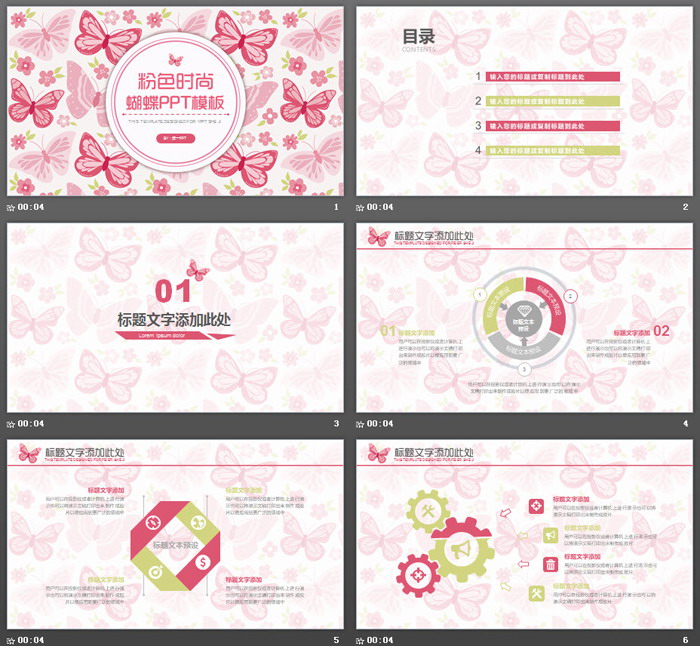 这是一套粉色时尚蝴蝶图案背景PPT模板,共24张;