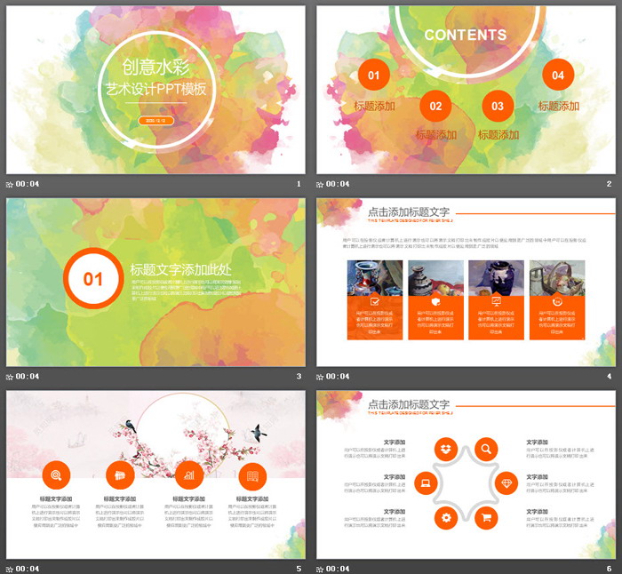 PowerPoint模板内容页,由22张橙色扁平化幻灯片图表制作。另外使用了多张水彩艺术花卉图片、水彩静物画等排版。