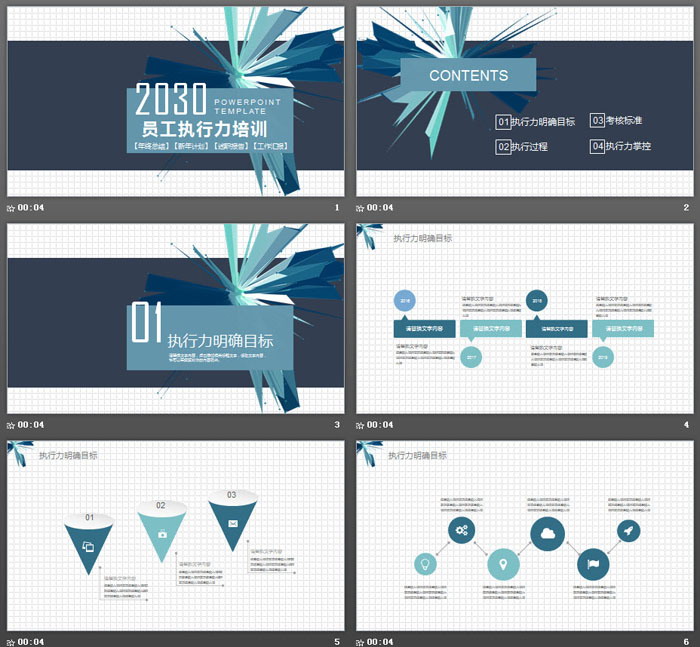 这是一套蓝色放射多边形背景的,员工执行力培训PPT模板,共24张;
