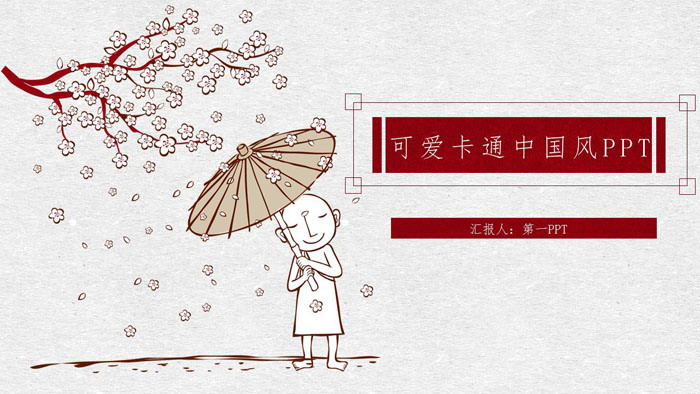 PPT模板使用了卡通风格绘制。封面为一个可爱的小和尚,站在花瓣飘落的桃花树下。右侧放置古典风格的文本框,填写PPT标题文字。界面可爱卡通。