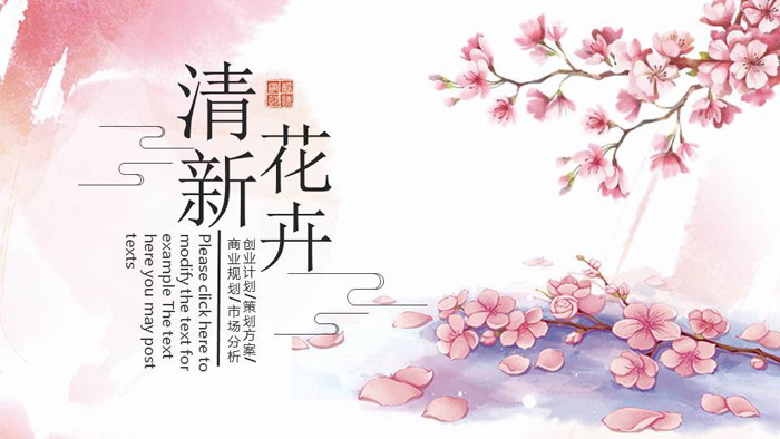 PPT模板使用了粉色水彩绘制的唯美花卉PPT背景图。左侧填写PPT标题文字,并使用黑色波浪纹装饰。界面清新唯美。
