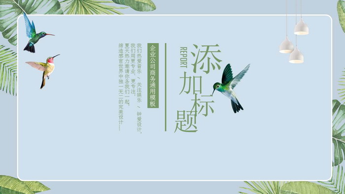 PPT模板使用了水彩绘制的绿色阔叶PPT背景图。首页中间放置圆角矩形,中间竖向填写PPT标题文字,周围使用三只小鸟装饰。界面清新艺术。
