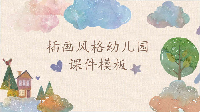 PPT模板使用了彩色水彩插画风格设计。首页放置了水彩绘制的树木、房子、云朵等PPT背景图。中间填写幼儿园PPT课件标题文字,周围使用小爱心、小星星装饰。界面卡通可爱。