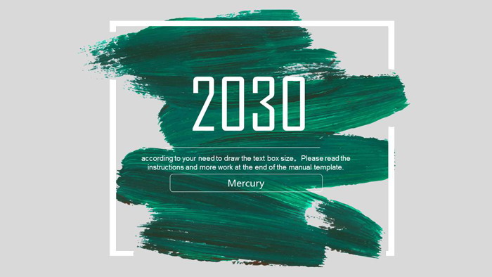 PPT模板使用了淡雅灰色底色。首页中间放置绿色油画笔触和白色边框PPT背景图。中间填写PPT标题文字。界面简洁艺术。