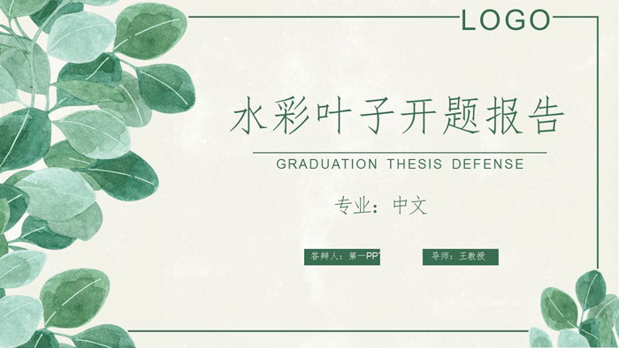 PPT模板使用了水彩绘制的绿色叶子PPT背景图。首页右侧填写毕业论文开题报告PPT标题。界面清新文艺。
