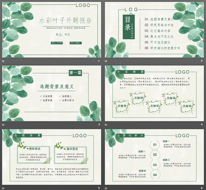 这是一套清新水彩叶子背景的,毕业论文开题报告PPT模板,共29张;