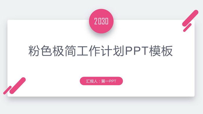 PPT模板使用粉色为主题色。首页中间放置带有阴影的白色矩形卡片PPT背景图。中间填写新年工作计划PPT标题,周围使用粉色短线条装饰。界面及其简洁。