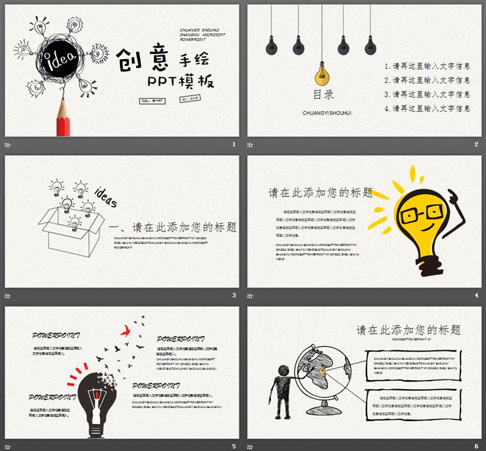 关键词:铅笔手绘PPT模板,创意电灯、灯泡PPT背景图片。.PPTX格式;