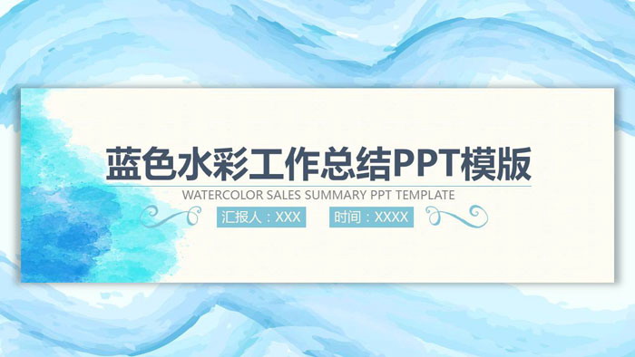 PPT模板使用了蓝色水彩绘制的抽象波纹PPT背景图片。首页中间放置带有阴影效果的水彩矩形PPT文本框,填写销售工作总结PPT标题文字。界面清新艺术。