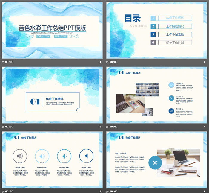 这是一套蓝色水彩背景的,销售工作总结PPT模板,共24张;