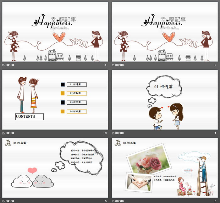 这是一套卡通手绘风格的,《幸福记事》情人节告白爱情相册PPT模板,共23张;