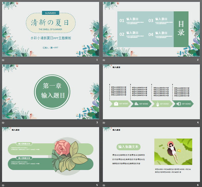 这是一套清新水彩植物背景的夏日PPT主题模板,共22张;