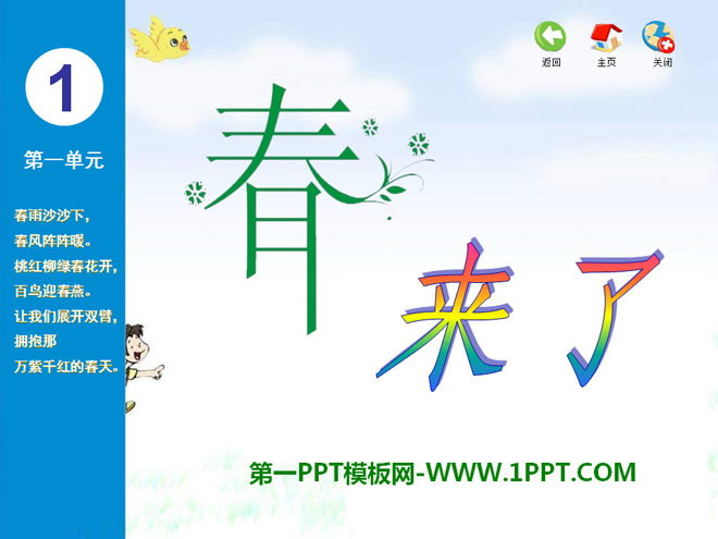 关键词:春来了教学课件,一年级下册音乐PPT课件下载,一年级音乐幻灯片课件下载,春来了PPT课件下载,.PPT格式;