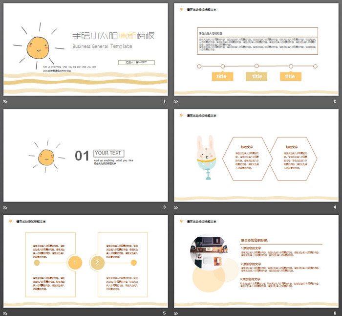 PPT模板首页,使用了手绘小太阳和黄色波纹PPT背景图片。右侧填写PPT标题文字。界面卡通可爱。