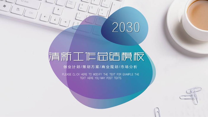 PPT模板封面,使用了摆放了咖啡杯、电脑键盘、曲别针的白色办公桌面PPT背景图片。中间在蓝紫渐变多边形内,填写工作总结PPT标题文字。界面简洁清爽。