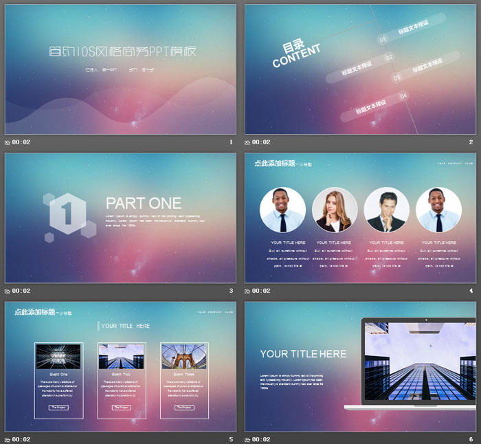 这是一套简洁蓝紫渐变iOS风格PPT模板,共26张;
