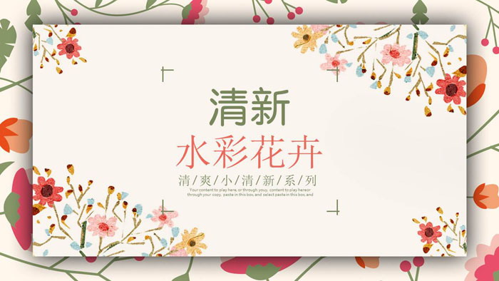 PPT模板使用了水彩绘制的彩绘花卉PPT背景图片。中间放置带有阴影效果的矩形图案,填写PPT标题文字。界面清新雅致。