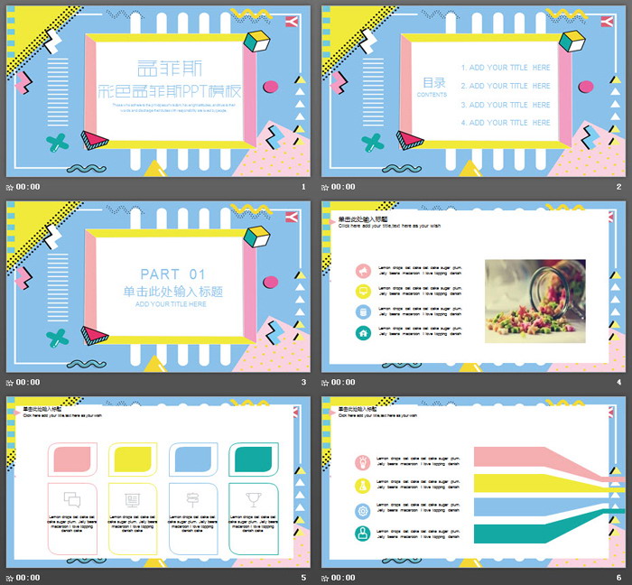 这是一套彩色孟菲斯风格PPT模板,共19张;