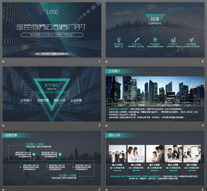 这是一套深蓝建筑背景的的,公司简介PPT模板,共28张;