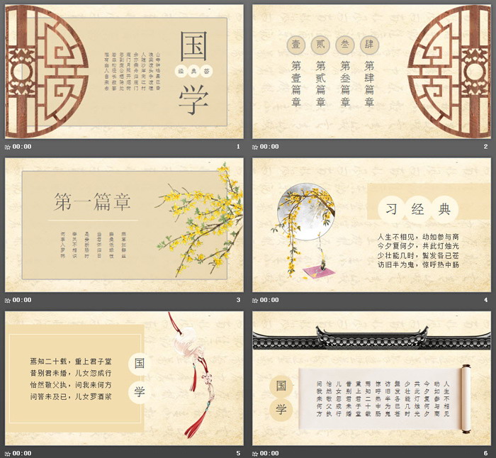 PPT模板使用了古典纸张底图。首页左侧放置木质古典图案PPT背景图片,右侧填写国学PPT标题,和相关文字介绍。界面风格古典雅致。