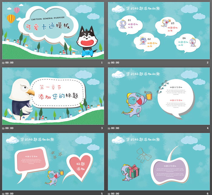PowerPoint模板内容页,由多张卡通小动物插图与卡通风格的文本框设计排版。小动物插图包括:小恐龙、小熊、老鹰、小狗等。