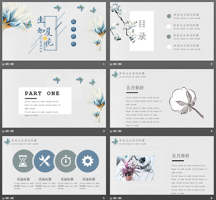 这是一套水彩花卉蝴蝶背景的,生如夏花五月你好PPT模板,共22张;