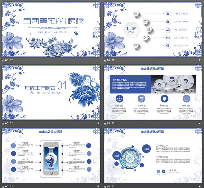 这是一套蓝色青花风古典花卉背景PPT模板,共37张;