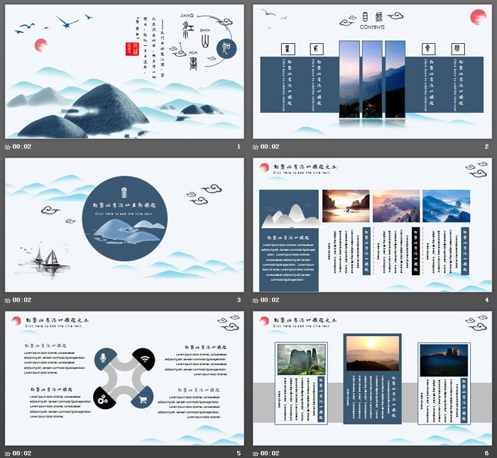 PowerPoint模板内容页,有17张蓝色黑色搭配的扁平化幻灯片图表,与幻灯片文字排版制作。另外使用了中国古建筑PPT插图、自然风景PPT插图、水墨古树PPT插图、水墨帆船PPT插图等装饰。
