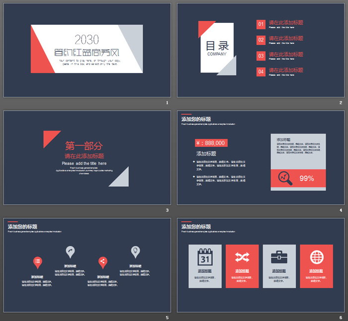 这是一套简洁红蓝配色通用商务PPT模板,共23张;