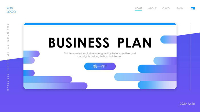 PPT模板封面以蓝色白色拼色背景。中间放置白色卡片,使用蓝色渐变线条填充。中间填写PPT标题文字。界面简洁且商务感十足。