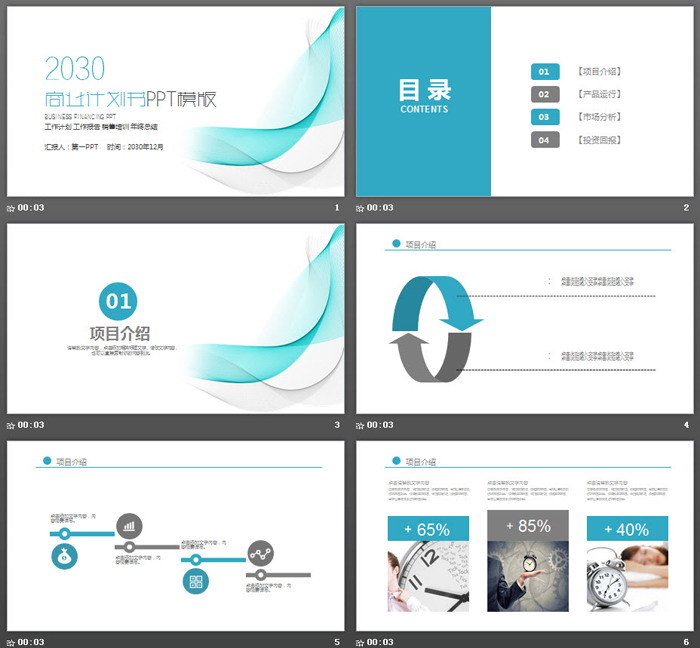 PowerPoint模板内容页,由22张蓝色灰色搭配的实用幻灯片图表,与商业计划书文案排版制作。另外使用了商务人物PPT插图、钟表PPT插图等装饰。