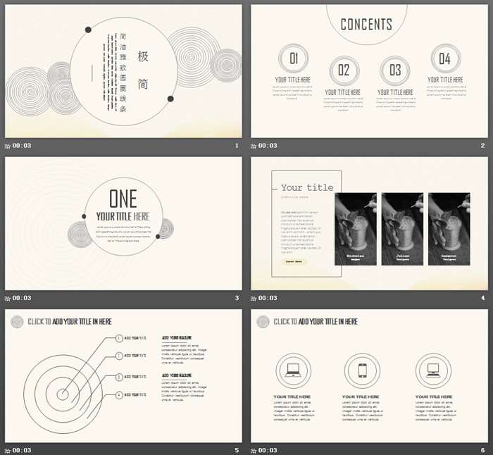 PPT模板使用了淡雅黄色渐变底图。首页放置了多个黑色细线圆圈PPT背景图片,中间放置圆形图案,填写PPT标题文字。界面为极简风格。