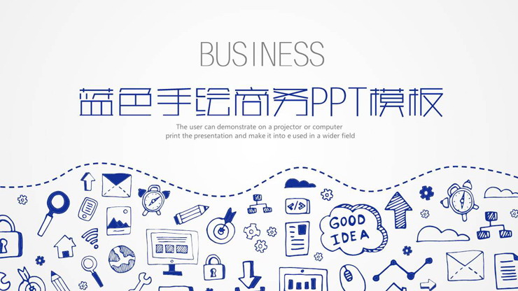 PPT首页,使用手绘的商务办公PPT图标PPT背景图。中间填写商务汇报PPT标题文字。界面简洁有趣。