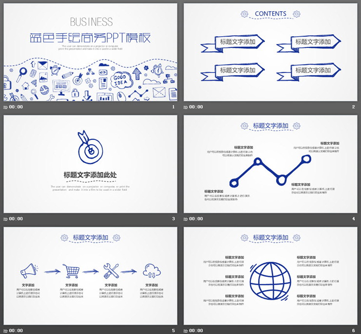 PowerPoint模板内容页,由23张蓝色手绘幻灯片图表,搭配PPT文字排版。另外使用了商务办公PPT插图、办公桌面PPT插图等装备。