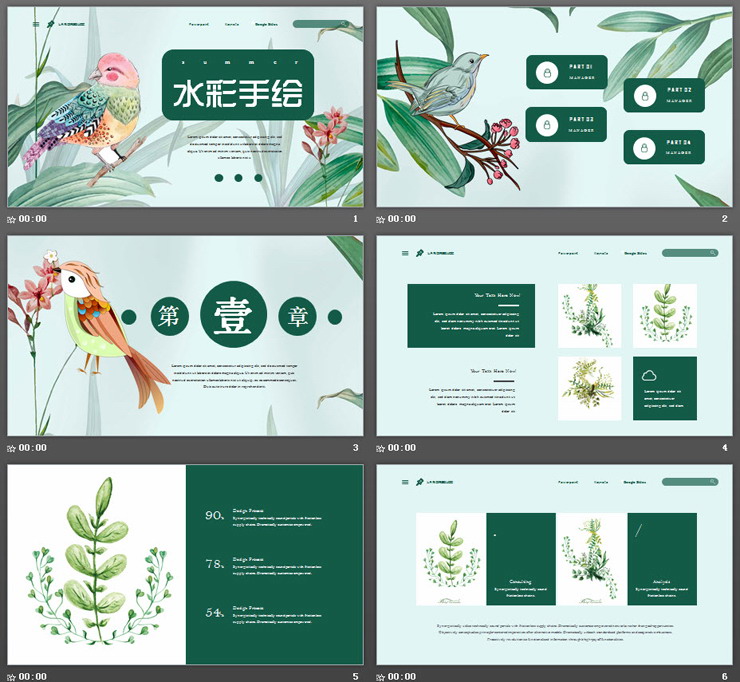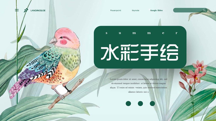 彩色水彩手绘绿叶小鸟PPT模板,共24页;
