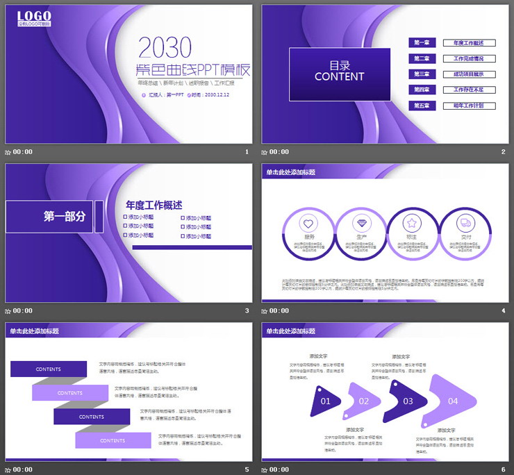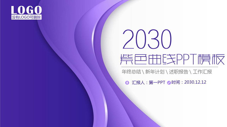 PPT模板首页左侧为紫色背景右侧为白色背景,中间放置三条叠加的优美曲线图案填充。