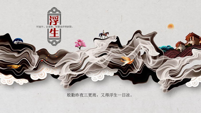 PPT模板首页,棕色烟雾和云朵上,有骑马的人物、房屋、花树等元素。给人一种仿佛置身梦境的虚幻。左侧填写浮生若梦PPT标题文字。