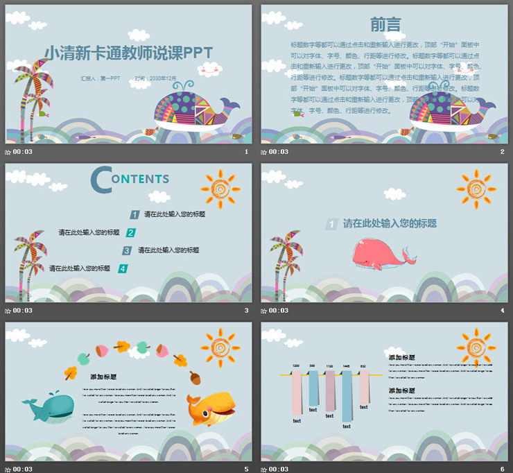 PPT模板使用了卡通插画风格设计制作。封面放置海浪、鲸鱼、椰子树等PPT背景图片。中间填写教师说课PPT标题。界面卡通可爱。
