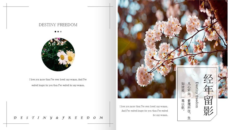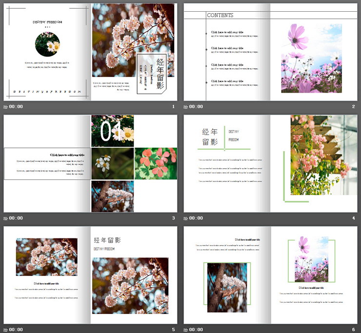 PPT模板使用了画册风制作,PPT封面摆放了额植物鲜花PPT背景图片,和电子相册标题等。界面清新文艺。