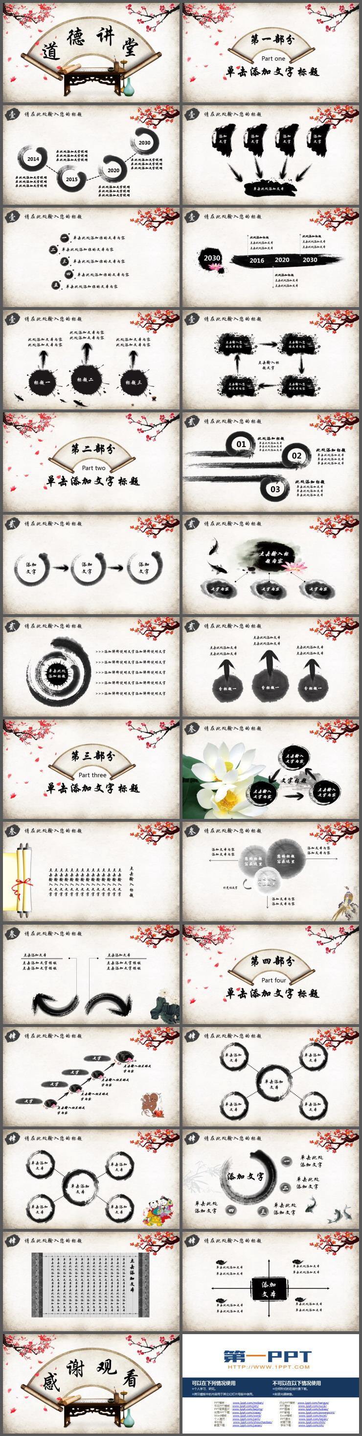 古典梅花卷轴背景的道德讲堂PPT模板,共27张;