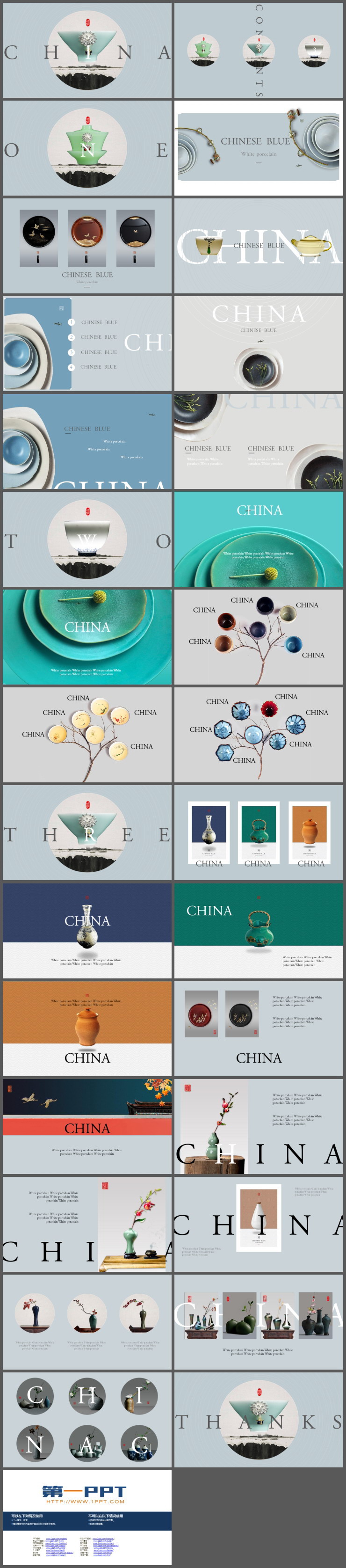 PPT模板是以多张精美中国陶瓷图片,制作成的PPT画册。瓷器包括:青花瓷、茶盏、花瓶、餐具、瓷罐等。